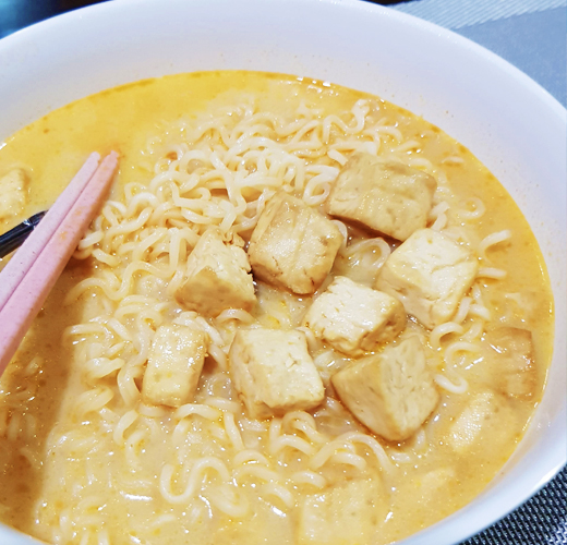 Another curry instant noodles because I am all about that spicy life. Throw in some leftover tofu or other alternative, treplace some of that starchy water with some milk, and then add a dollop of sambal or other chilli. Easy and so yummy!